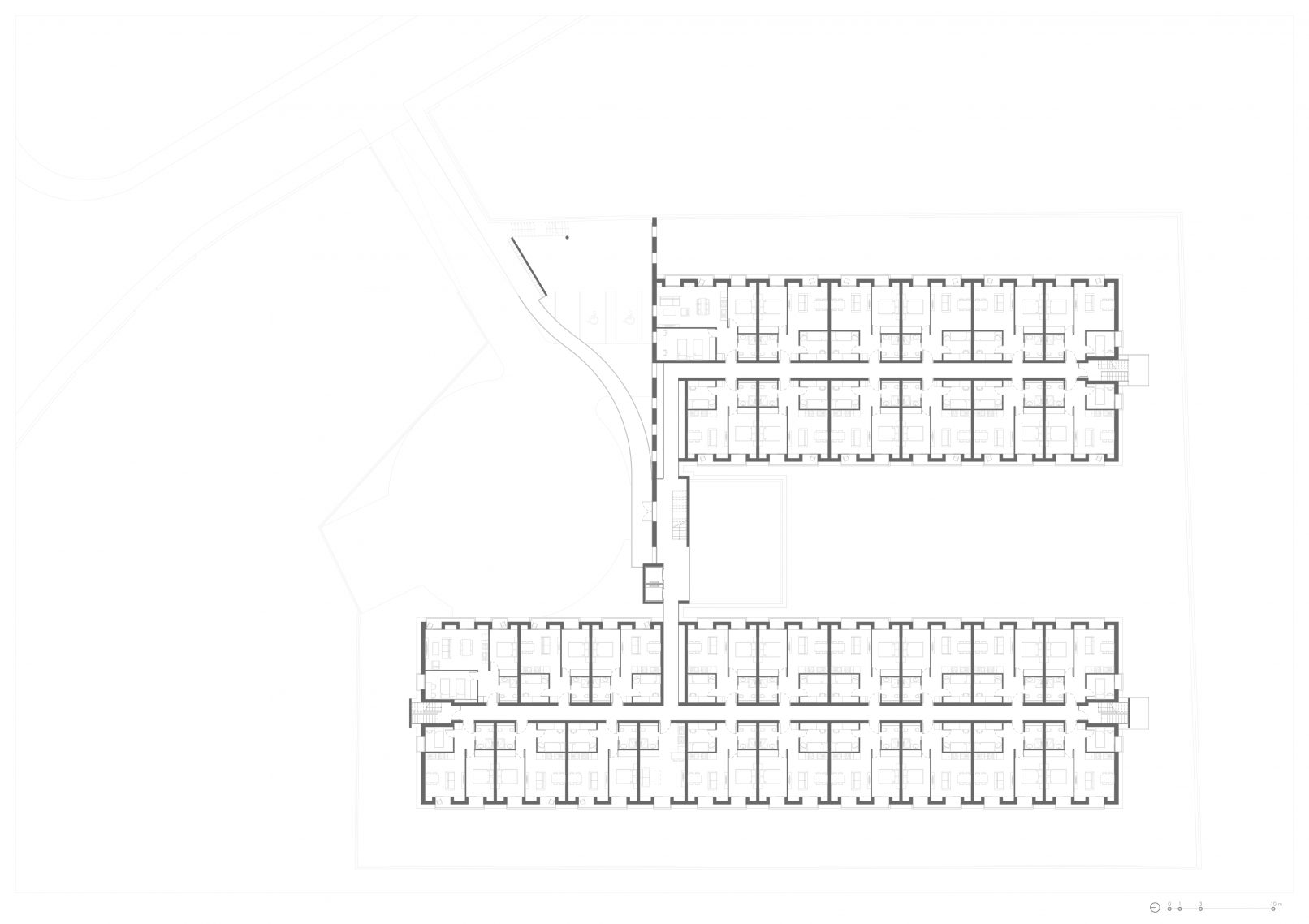 A construção dos corpos, longilíneos, correspondem ao uso da habitação multifamiliar em linha, conjugando na zona central os acessos verticais e as áreas comuns do condomínio. O espaço de conexão entre volumes coincide com um edifício pré-existente a manter.